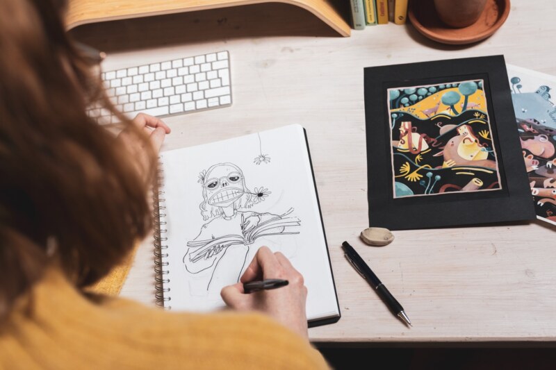 We gingen aan de slag en waren niet na één foto klaar (wat ik op voorhand dacht). Vera kwam met allerlei ideeën. Zo maakte ze ook detailfoto’s van mijn tekenmateriaal en mijn bureau, fotografeerde ze niet alleen mijn gezicht maar ook mijn handen die bezig waren met werken en had ze trucjes om spontane foto’s te maken. Tussendoor liet Vera mij de foto’s zien en kon ik aangeven wat ik wel en niet mooi vond. Nog even vlug naar buiten toen het droog was voor de laatste foto’s en de dag zat erop.